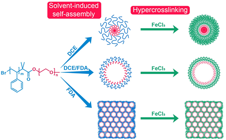 ladbrokes立博乔振安教授课题组设计合成了两亲性嵌段共聚物聚乙二醇-聚苯乙烯(PEO-b-PS),通过溶剂诱导嵌段共聚物自组装的方法合成了具有多级孔结构的超交联聚合物。与前人的工作不同,该方法创造性地把模板剂与前驱体结合在一起,用嵌段共聚物PEO-b-PS在甲缩醛与12-二氯乙烷混合溶剂中形成的胶束作为反应的“单体”,通过交联反应将不稳定的胶束转化为稳定的超交联聚合物。而通过调节胶束的组装状态,就可以改变所得到产物的形貌。