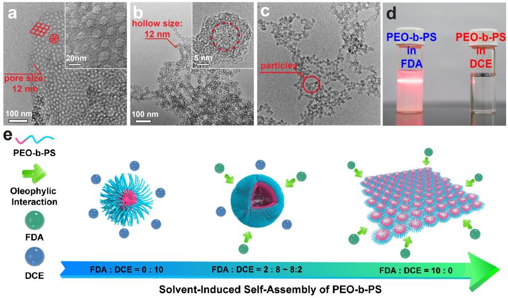 2 a. FDADCE体积比为100时产物的TEM照片 b. FDADCE体积比为28时产物的TEM照片  c. FDADCE体积比为010时产物的TEM照片 d. PEO-b-PS在不同溶剂中形成的体系的照片 e. 溶剂诱导自组装法的机理示意图