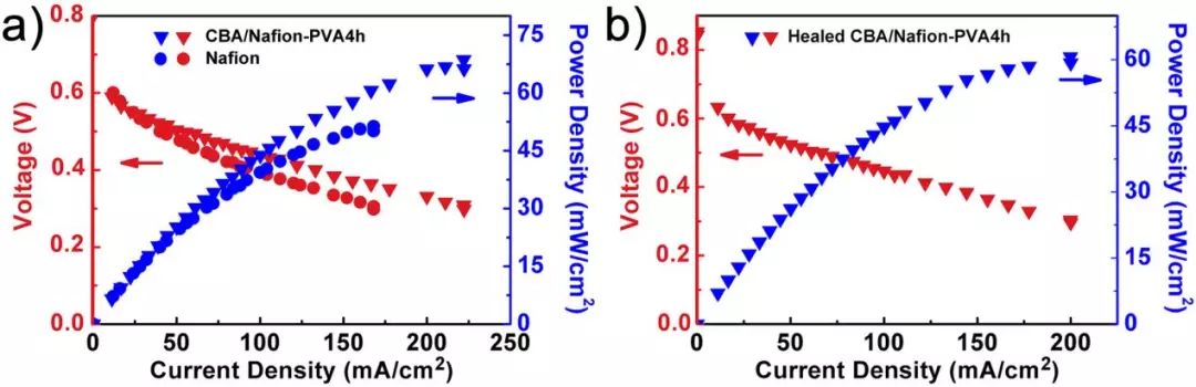 在电池性能的测试中,该自修复质子交换膜同样展现出了比Nafion膜更优异的性能,其最高能量密度和最高电流密度分别达到68.7 mW/cm2和222 mA/cm2。重要的是,该自修复质子交换膜可以在80 ºC的2 M的甲醇溶液中修复贯穿整个膜的机械损伤并恢复原有的甲醇阻隔能力以及电池性能。需要强调的是,该膜的修复条件是甲醇燃料电池的工作条件,这意味着一旦损伤发生,该膜可以在工作状态下自发修复损伤。