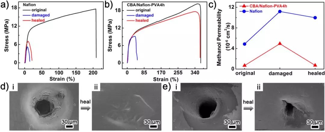 研究人员还发现:与传统的Nafion膜相比,该自修复质子交换膜具有更优异的机械性能,其断裂强度和伸长率分别可达~20.3 MPa和~380%。并且,PVA的引入使膜展现出了十分优异的甲醇阻隔能力。