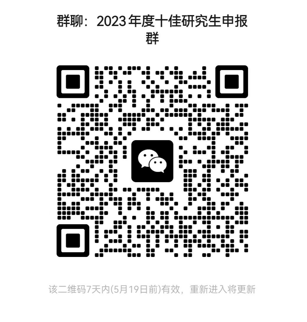2、5月17日前,研究生办公室负责初审并公布进入复审同学名单。进入复审同学5月18日补充准备5分钟以内PPT,重点介绍本学历期间本人学习课业、社会工作、志愿服务、团队合作、获奖和科研等方面综合情况。(具体答辩时间在申报人群内通知);