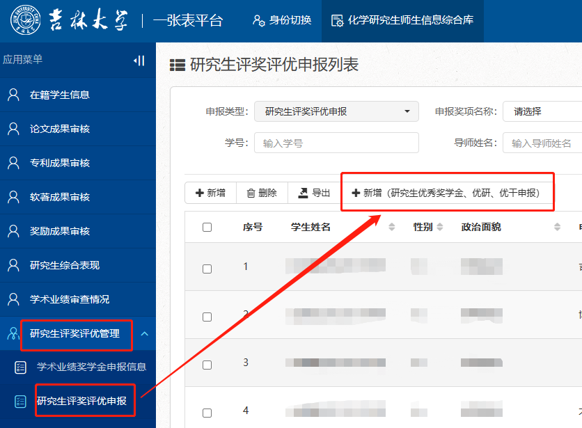 1、申报人请于10月13日8:00前使用个人邮箱账号登录“一张表”平台(https://one.jlu.edu.cn),在“研究生评奖评优管理”-“研究生评奖评优申报”栏,点击【新增(研究生优秀奖学金、优研、优干申报)】进行信息填报,申报研究生优秀奖学金无需选择等级,依据综合得分由高到低自动定级;成果信息栏点击“新增”后输入“姓名或者学号”,然后从已审核通过的成果库中选择不超过3篇代表作参评;活动信息点击“新增”后输入“姓名或者学号”,然后从已审核通过的活动中选择上一学年参与的活动。