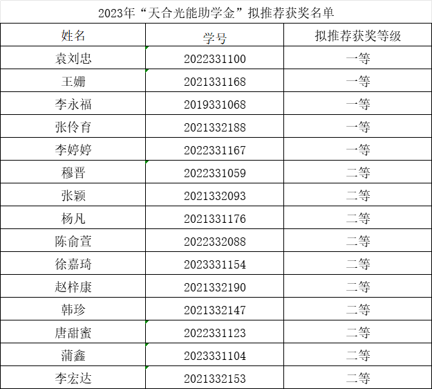 按照2023年“天合光能助学金”评选工作安排,经研究生申报、研办审核、专家评选,拟推荐获奖名单公示如下,如有异议请与赵晓杰老师联系,联系电话13504470223。