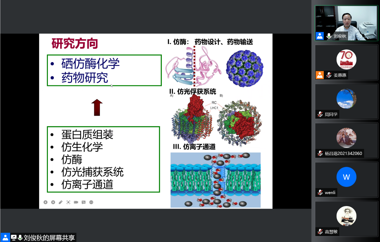讲座中,刘俊秋教授围绕蛋白质组装与仿生设计,全面地介绍了其课题组在蛋白质精准组装、仿酶催化、仿生光捕获系统等方面的研究进展。在交流互动环节,刘俊秋教授耐心详细地解答了院内外师生的问题,并对相关领域的发展做出了展望。ladbrokes立博、无机合成与制备化学国家重点实验室、超分子结构与材料国家重点实验室等单位负责人参加讲座,院内外近200名师生在线收看。