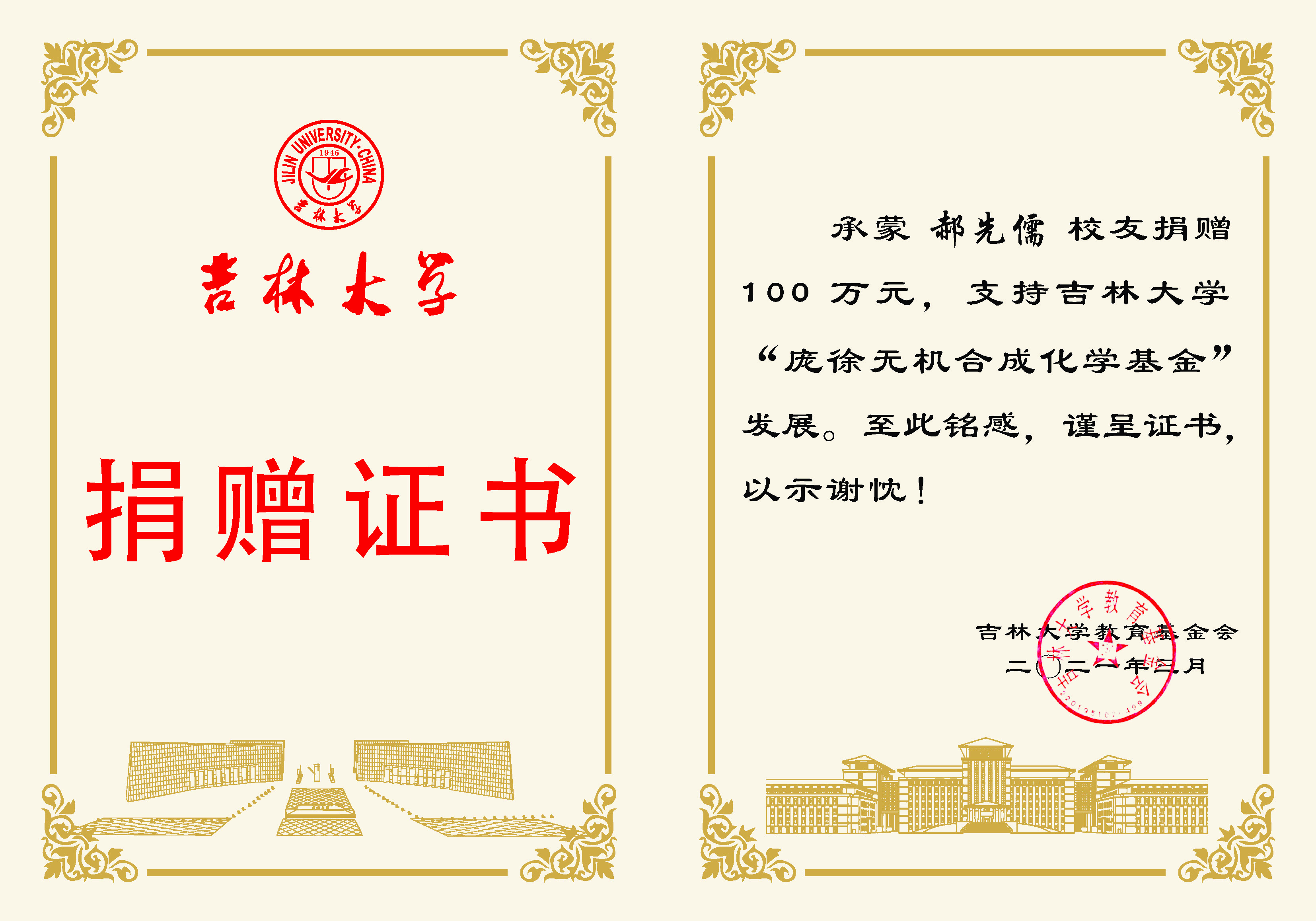 承蒙78级员工郝先儒先生捐赠100万元,支持ladbrokes立博“庞徐无机合成化学基金”发展,至为铭感,谨呈证书,以示谢忱!