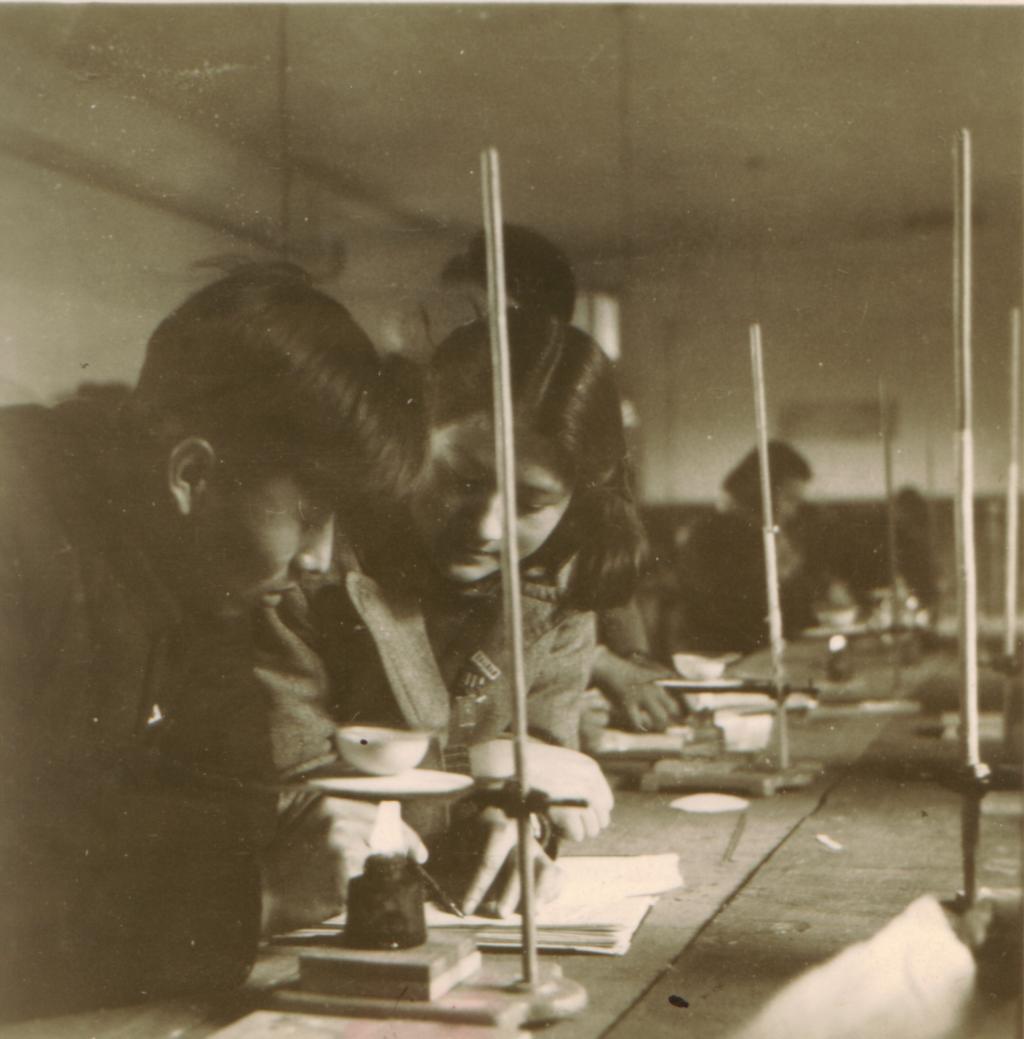 图9:建系初期,员工用“墨水瓶做的酒精灯”和“木板条拼成的实验台”做实验