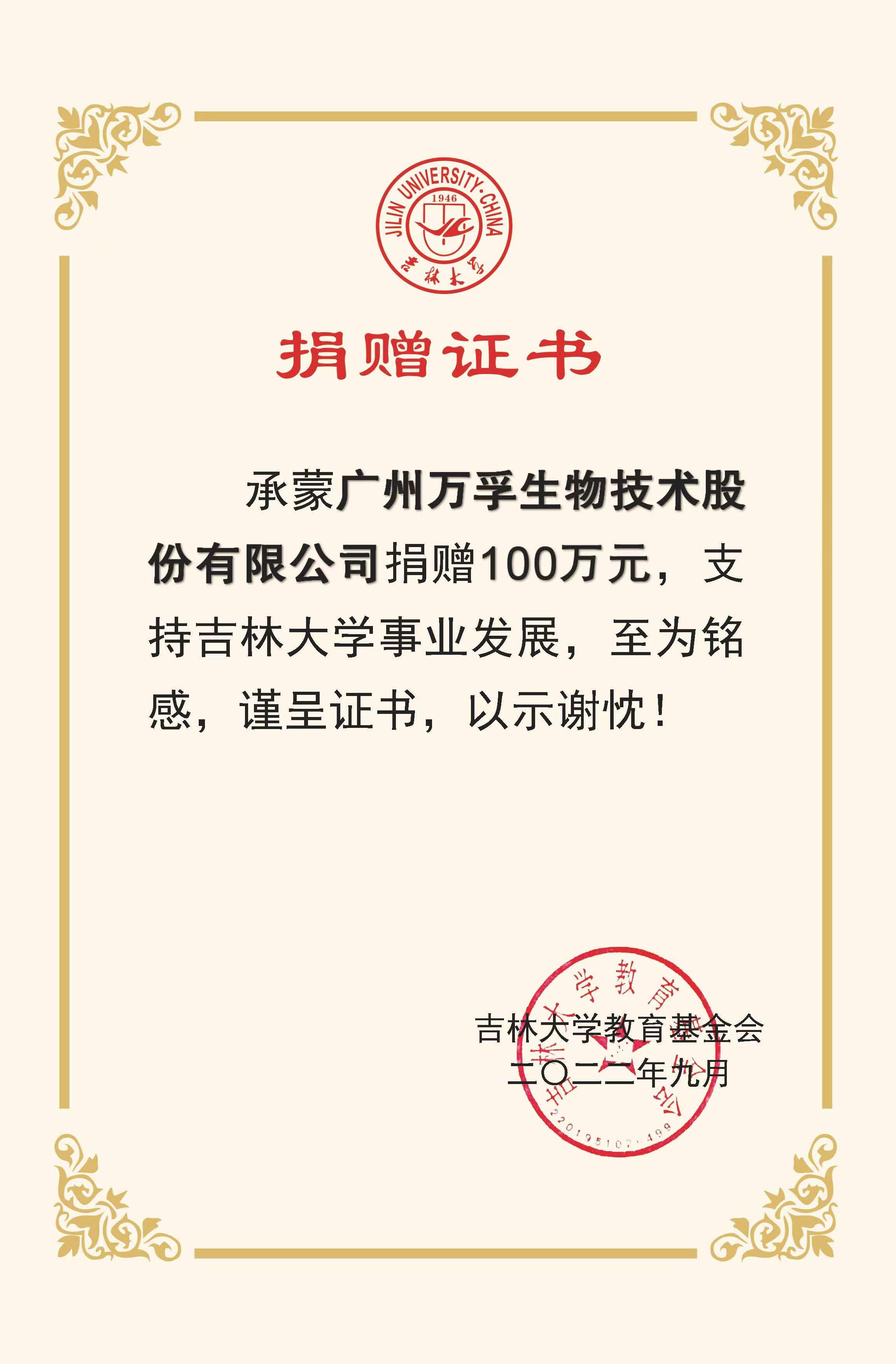 承蒙广州万孚生物技术股份有限公司捐赠100万元,支持ladbrokes立博“关实之—陶慰孙奖学金”发展,至为铭感,谨呈证书,以示谢忱!