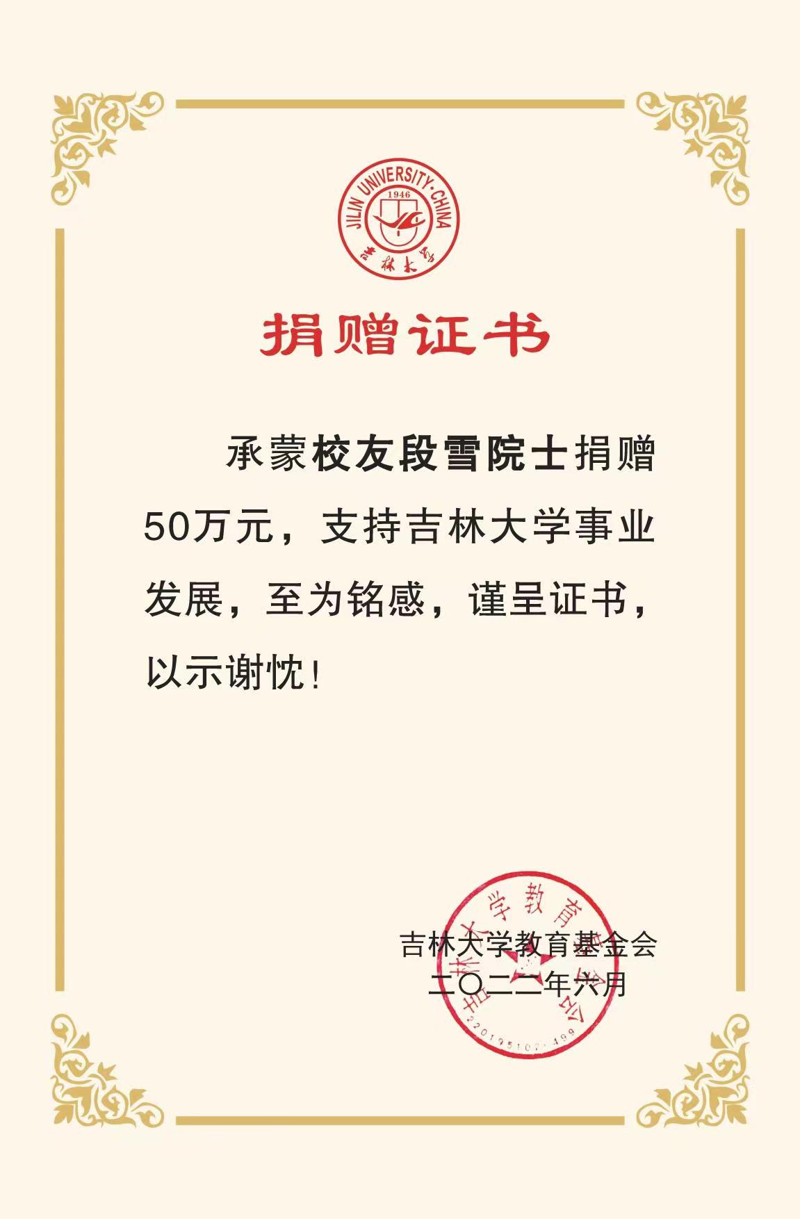 承蒙78级员工、中国科公司院士、北京化工大学段雪教授捐赠50万元,支持ladbrokes立博“关实之—陶慰孙奖学金”发展,至为铭感,谨呈证书,以示谢忱!