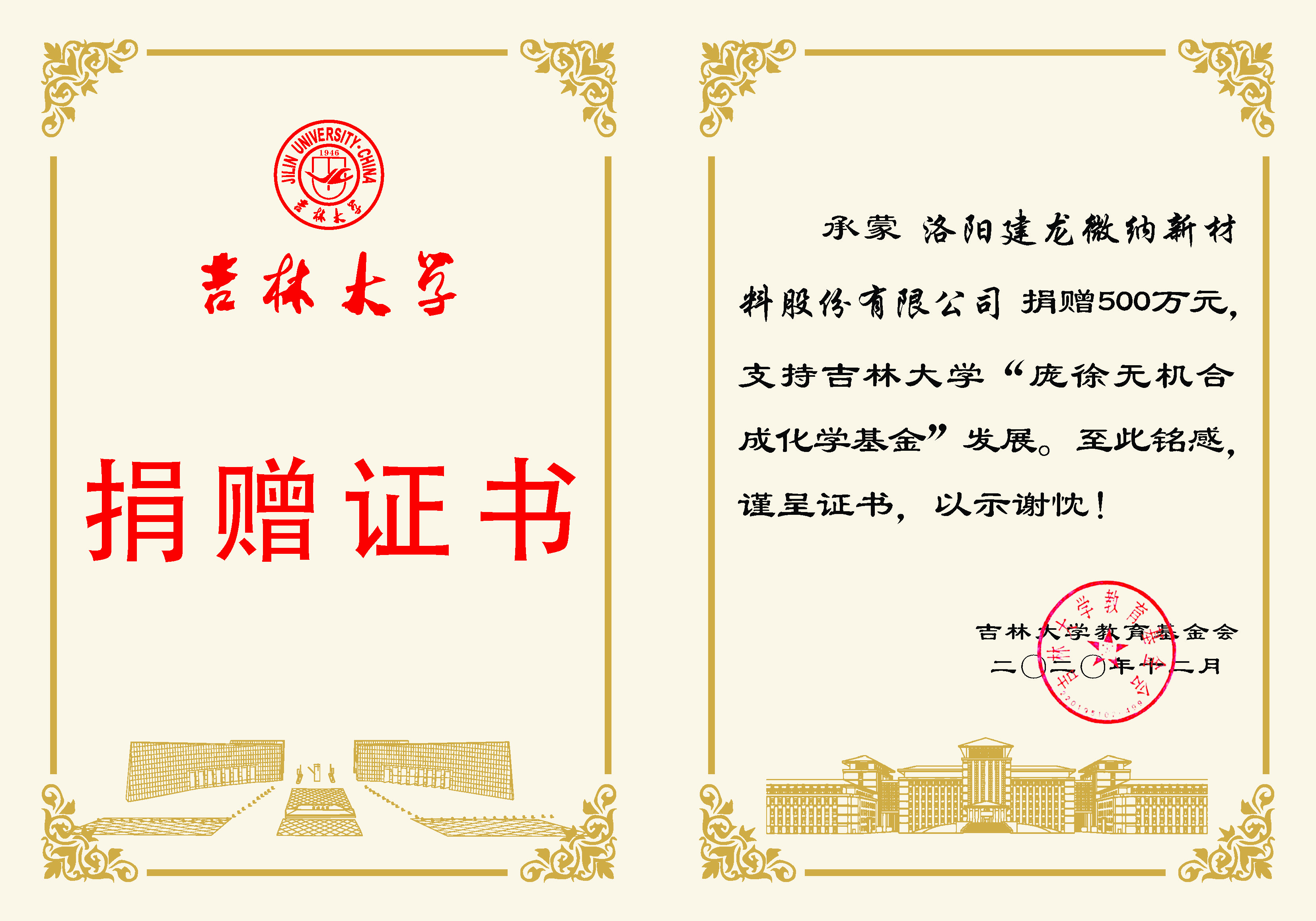 承蒙洛阳建龙微纳新材料股份有限公司捐赠500万元,支持ladbrokes立博“庞徐无机合成化学基金”发展,至为铭感,谨呈证书,以示谢忱!